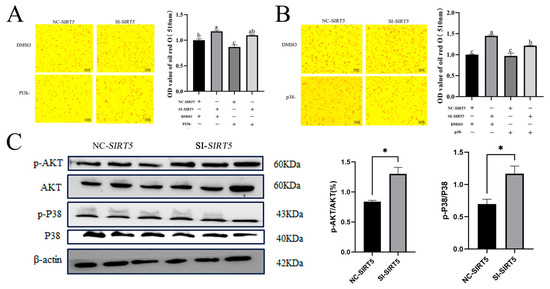 Interference with SIRT5 gene promotes lipid deposition in goat premise adipocytes through PI3K-Akt and MAPK signaling pathways. (A) The promotion of cellular lipid deposition by interference with SIRT5 is dependent on the PI3K-Akt pathway. (B) The promotion of cellular lipid deposition by interference with SIRT5 is dependent on the MAPK pathway. (C) Western blot detection of the changes in the levels of p-AKT/AKT and p-p38/p38 proteins after overexpression and interference with p-AKT/AKT and p-p38/p38 protein levels after SIRT5. Data are shown as mean ± SEM, ‘*’ indicates p < 0.05. Different lower case letters indicate significant differences.