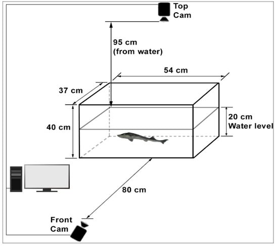 Figure 1. The dimensions of the glass tank were 54 × 37 × 40 cm. This system included two high-resolution cameras, a suitable lighting scheme, and the necessary software components. The cameras mounted on the side and top of the aquariums were identical. All images were taken with these standard webcams at a 1920 × 1080 resolution, 96-dpi dot density, and 24-bit color resolution. The front camera used in the image acquisition process was located 80 cm above the water level, while the top camera was 95 cm above the water level. The cameras were placed perpendicular to the water, close enough to see only the water’s surface in the aquarium. When first installed, there were light glares on the water’s surface in the images taken from the upper camera, but these glares were eliminated by changing the location of the light source. In the side camera images, the camera’s reflection was also very faintly visible in the aquarium glass, but the image of this object was continuous. In the same place, the algorithm did not detect this, and, thus, it did not affect the work. The glass tank water height was 20 cm, which is the height at which the fish could move freely horizontally and vertically, considering the size of the fish.