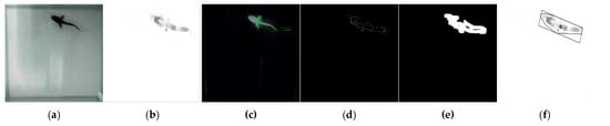 Figure 2e) were applied to detect the edges of the fish whose motion information was extracted from the image created with this information. At this stage, the area occupied by the fish in the image appeared in black and white. Finally, a polygon was drawn around this area, covering this area as a minimum, and its center was calculated (