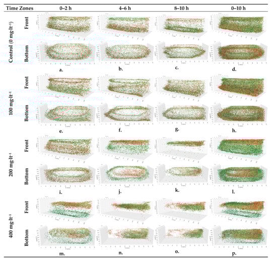 Figure 3o). There was an air tube in the rear-left corner of the glass tank, and the experimental group tended to move away from the air stone in the mentioned time period. When all the coordinates of the fish in the 400 mg·lt