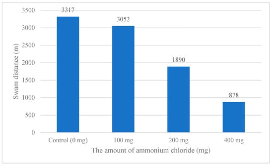 A. gueldenstaedtii swam in the glass tanks, they averaged 3317, 3052, 1890, and 878 m across the two replicates for each ammonia concentration, respectively. The amount of ammonium and the