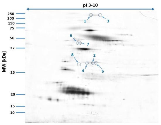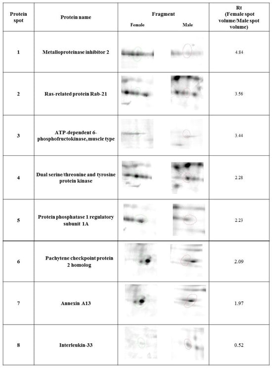 Protein expression analysis was performed using Delta2D software version 4.8 (DECODON, Greifswald, Germany), which allowed for the quantification of protein spots and the creation of expression profiles. The software employed a warping algorithm to align gel images, generating a fused proteome map that included all protein spots identified throughout the experiment. Manual verification was performed to exclude false positives and false negatives. The ratio quotient for the female group’s means of relative spot volumes was presented: the volume of a given spot in the male group was the denominator of the ratio parameter. The ratio quotient (Rt) value for a given expressed protein was used >1.5 as the up-regulation threshold and <0.67 as the downregulation threshold [21,22,23].