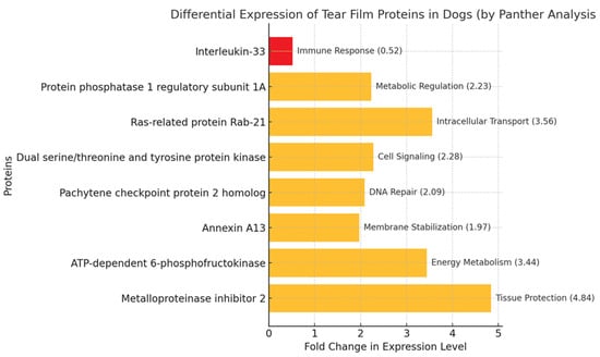 Rather than focusing solely on hormonal influences, it is valuable to compare the observed sex-related differences in tear film proteins with findings in other species. Previous studies on human tear proteomics have identified sex-related variations in several proteins involved in inflammation, metabolism, and tissue homeostasis. In other mammalian species, sex differences in the expression of TIMP-2, PFK, and IL-33 have been noted in tissues such as adipose tissue, brain, and immune cells [24,26,27].
