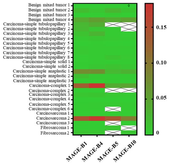 The relative fold change in the mRNA expression of MAGE-B1, -B4, -B5, and -B10 from canine mammary tumor tissues using GAPDH as a reference gene []. The heat map presents the fold change in 2(−∆∆CT) values. The lack of data means there was no mRNA expression detected (Ct cycle > 35). The fold change expression ranged between 0 and 0.20. The 0 value or green color means the level of expression is low, while the 0.20 value or red color means the level of expression is high.