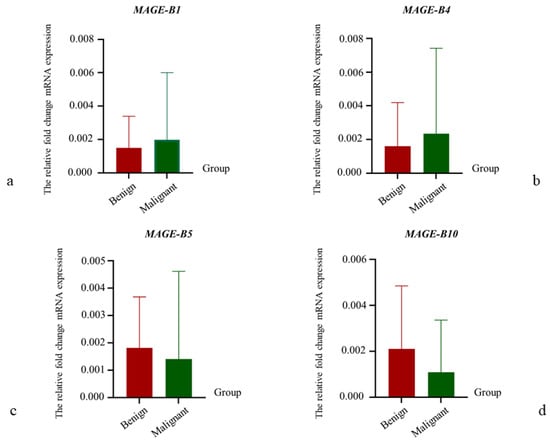 The comparisons of mean level of relative fold change in the mRNA expression results of MAGE-B1, -B4, -B5, and -B10 genes between benign and malignant CMTs. (a): A comparison of the mean level of relative fold change in the mRNA expression results of MAGE-B1 between benign CMTs (n = 4) and malignant CMTs (n = 24). (b): A comparison of the mean level of relative fold change in the mRNA expression results of MAGE-B4 between benign CMTs (n = 4) and malignant CMTs (n = 24). (c): A comparison of the mean level of relative fold change in the mRNA expression results of MAGE-B5 between benign CMTs (n = 4) and malignant CMTs (n = 19). (d): A comparison of the mean level of relative fold change in the mRNA expression results of MAGE-B10 between benign CMTs (n = 3) and malignant CMTs (n = 20).