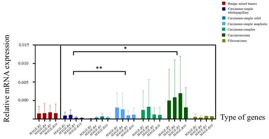 The results of the relative MAGE-B mRNA expression were calculated using the specified method and were illustrated separately according to histopathological subtype using a heat map (Figure 1). The mean levels of the relative fold change in the mRNA expression of MAGE-B genes were compared between benign and malignant CMTs (Figure 2). In comparisons between groups, the mean levels of the relative fold change in the mRNA expression of MAGE-B1 and -B4 were higher in malignant CMTs than in benign CMTs (Figure 2a,b). On the other hand, the mean levels of relative fold change in the mRNA expression of MAGE-B5 and -B10 were lower in malignant CMTs than in benign CMTs (Figure 2c,d). Among benign CMTs, the mean level of relative fold change in the mRNA expression of MAGE-B10 was the highest, followed by MAGE-B5, -B4, and -B1, respectively (Figure 3). Among malignant CMTs, the highest mean level of relative fold change in the mRNA expression of MAGE-B genes was observed in carcinosarcoma, followed by carcinoma-complex and carcinoma-simple anaplastic, respectively (Figure 3). Interestingly, the nested t-test analysis showed that the mean level of relative fold change in the mRNA expression of the MAGE-B gene group in the carcinosarcoma CMT samples was significantly higher than that in the carcinoma-simple tubulopapillary type of CMT samples (p ≤ 0.05). In addition, the relative fold change in the mRNA expression of the MAGE-B gene group in the carcinoma-simple anaplastic CMT samples was significantly higher than that in the carcinoma-simple tubulopapillary CMT samples (p ≤ 0.01).