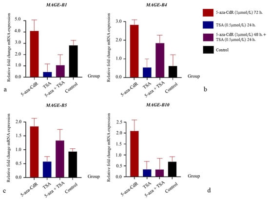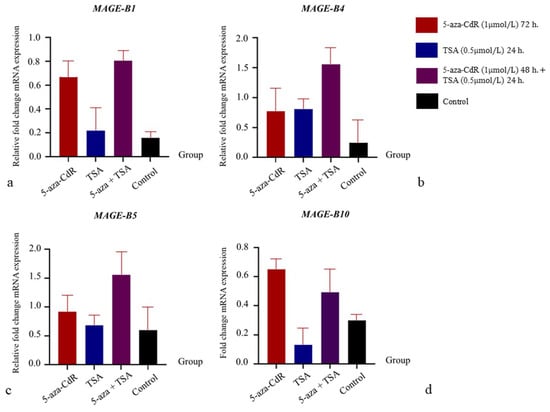 The influence of the DNA methylase inhibitor (5-aza-CdR) and histone deacetylase inhibitor (TSA) on the mRNA expression in benign mixed tumor cells is shown in Figure 4, and that in carcinoma-complex cells is shown in Figure 5. In benign mixed tumor cells, the level of fold change in MAGE-B1, -B4, -B5, and -B10 mRNA expression in cells treated with 5-aza-CdR was higher than in the control group, while the level of fold change in MAGE-B1, -B4, -B5, and -B10 mRNA expression in cells treated with TSA was lower than in the control group. Additionally, the level of MAGE-B1, -B4, -B5, and -B10 mRNA expression in cells treated with 5-aza-CdR followed by TSA was lower than in cells treated with 5-aza-CdR alone. In carcinoma-complex cells, the level of fold change in MAGE-B1, -B4, -B5, and -B10 mRNA expression in cells treated with 5-aza-CdR or 5-aza-CdR followed by TSA was higher than in the control group. In contrast, the level of fold change in MAGE-B1, -B4, and -B5 mRNA expression in cells treated with TSA alone was higher than in the control group, while the level of fold change in MAGE-B10 mRNA expression in cells treated with TSA alone was lower than in the control group. In contrast to benign mixed tumor cells, the level of fold change in MAGE-B1, -B4, and -B5 mRNA expression in malignant cells treated with 5-aza-CdR followed by TSA was higher than in those treated with 5-aza-CdR alone. Moreover, the level of fold change in MAGE-B10 mRNA expression in malignant cells treated with 5-aza-CdR followed by TSA was lower than in those treated with 5-aza-CdR alone.