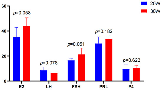 Comparison of serum hormone levels between 20W and 30W groups. E2: Estradiol (pg/mL); LH: Luteinizing hormone (mIU/mL); FSH: Follicle-stimulating hormone (mIU/mL); PRL: Prolactin (ng/mL); PROG: P4 (ng/mL).