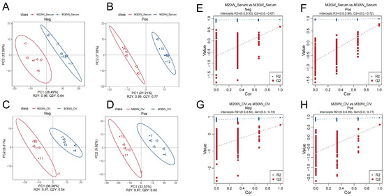 PLS-DA score plot and validation plot of differential metabolites. (A) PLS-DA score plot showing the separation of metabolites in the negative ion mode in serum; (B) PLS-DA score plot showing the separation of metabolites in the positive ion mode in serum; (C) PLS-DA score plot showing the separation of metabolites in the negative ion mode in ovary samples; (D) PLS-DA score plot showing the separation of metabolites in the positive ion mode in ovary samples; (E) Permutation test of PLS-DA in the negative ion mode for serum samples; (F) Permutation test of PLS-DA in the positive ion mode for serum samples; (G) Permutation test of PLS-DA in the negative ion mode for ovary samples; (H) Permutation test of PLS-DA in the positive ion mode for ovary samples.