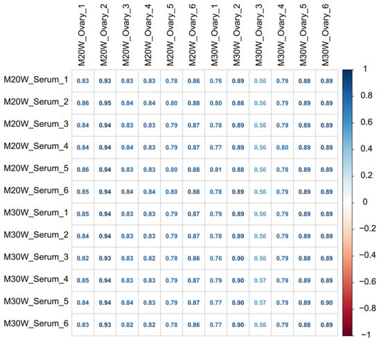 To explore the potential relationship between serum metabolites and the ovarian tissue metabolome, a correlation analysis was conducted, and the results are presented in Figure 4. The heatmap revealed a significant correlation between serum metabolites and ovarian tissue metabolites. Most metabolites exhibited strong positive correlations, with correlation coefficients ranging from 0.56 to 0.95. Notably, in the 20W and 30W groups, some samples’ metabolites showed exceptionally high correlation coefficients of up to 0.95. Meanwhile, a few samples displayed relatively weaker correlations, with the lowest observed correlation coefficient being 0.56. Additionally, differences in correlation patterns were noted across different groups, suggesting that serum metabolic characteristics may be closely linked to ovarian metabolic status. These findings provide valuable data for further investigation into the metabolic regulatory mechanisms underlying reproductive processes.