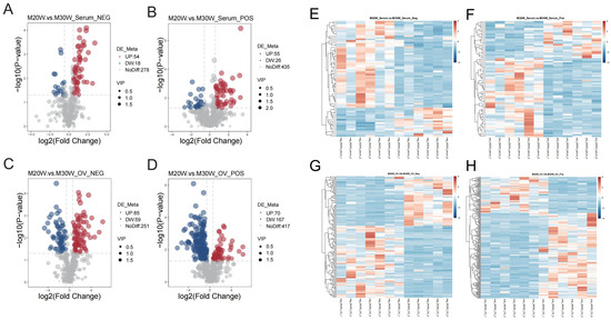 Volcano plot and heatmap of differential metabolites. (A) Volcano plot showing differential metabolites in negative ion mode in serum. Red represents upregulated metabolites, blue represents downregulated metabolites; (B) Volcano plot showing differential metabolites in positive ion mode in serum; (C) Volcano plot showing differential metabolites in negative ion mode in ovary samples; (D) Volcano plot showing differential metabolites in positive ion mode in ovary samples; (E) Heatmap of the differential metabolites in serum for the negative ion mode; (F) Heatmap of the differential metabolites in serum for the positive ion mode; (G) Heatmap of the differential metabolites in ovary samples for the negative ion mode; (H) Heatmap of the differential metabolites in ovary samples for the positive ion mode.
