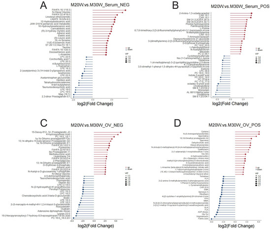 Differential metabolites in stick bar plot. (A) Differential metabolites in negative ion mode in serum; (B) Differential metabolites in positive ion mode in serum; (C) Differential metabolites in negative ion mode in ovary; (D) Differential metabolites in positive ion mode in ovary.