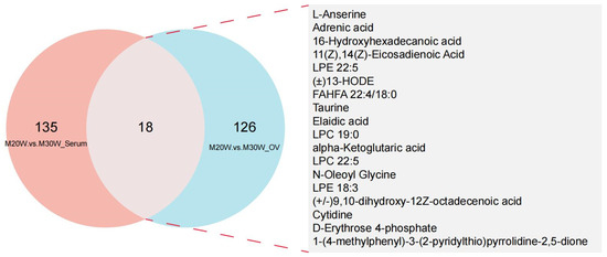 Venn diagram of differential metabolites between serum and ovary. M20W vs. M30W Serum: Differential metabolites in serum between 20W and 30W groups; M20W vs. M30W Ovary: Differential metabolites in ovary between 20W and 30W groups; Overlap: Shared differential metabolites between serum and ovary samples.