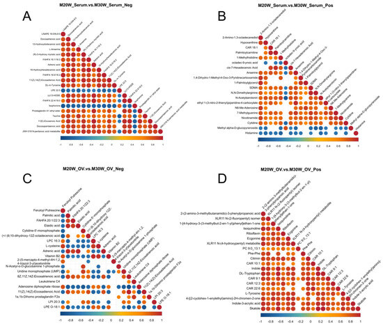 Correlation analysis of differential metabolites. (A) Correlation analysis of differential metabolites in negative ion mode in serum; (B) Correlation analysis of differential metabolites in positive ion mode in serum; (C) Correlation analysis of differential metabolites in negative ion mode in ovarian samples; (D) Correlation analysis of differential metabolites in positive ion mode in ovarian samples.