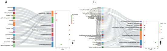 KEGG pathway enrichment of differential metabolites. (A) KEGG pathway enrichment of differential metabolites in serum; (B) KEGG pathway enrichment of differential metabolites in ovary tissue.