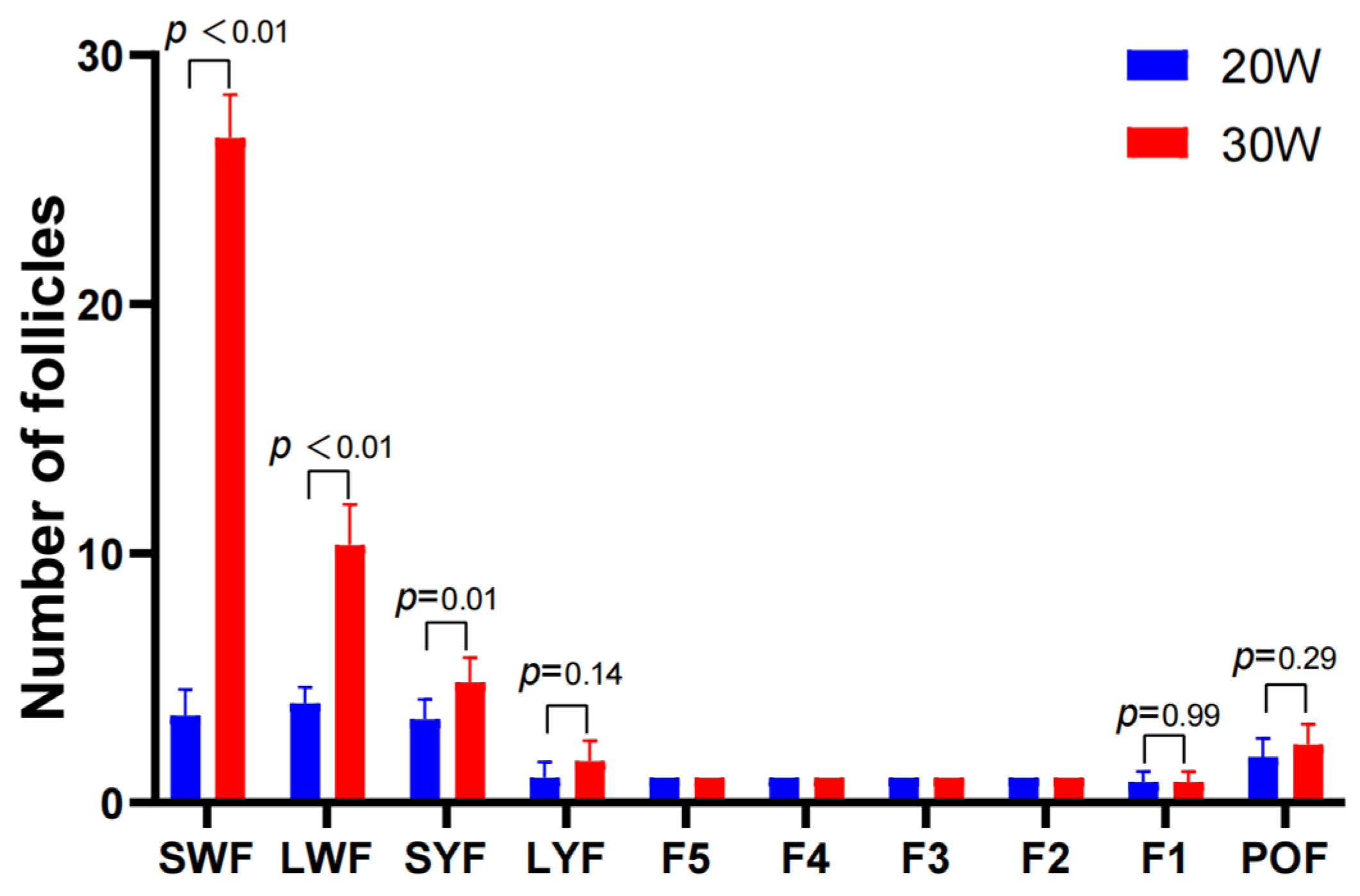 The hormone results showed that there were different trends in serum hormone levels between the 20W group and the 30W group. The level of luteinizing hormone (LH) was slightly higher at 20 weeks of age than at 30 weeks of age. The levels of estradiol (E2) and follicle-stimulating hormone (FSH) in the 30W group were higher than those at 20 weeks of age, while the levels of prolactin (PRL) and progesterone (P4) showed minimal variation between the two groups and maintained a relatively stable trend. Overall, the hormone levels in the 30-week group were slightly higher than those in the 20W group, with particularly pronounced increases observed for E2 and FSH (Figure 2).