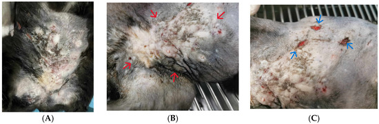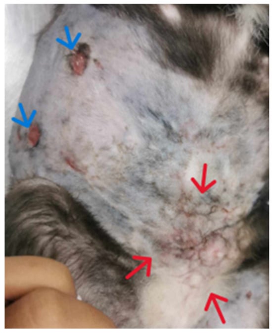 Pre-diagnosis. Skin lesions showing large area of subcutaneous nodules with multiple draining tracts on ventral abdomen. (A): Before clipping. (B): Left inguinal and prepubic areas with multiple, firm subcutaneous nodules and draining tract (red arrows). (C): Right ventral flank showing three opening sites of draining tract (blue arrows).