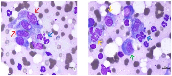 Diagnosis. Cytology from fine-needle aspiration of granuloma revealed multinucleated giant cells (yellow arrows), macrophages (green arrow), and large spindle cells (red arrows), as well as degenerate neutrophils (blue arrows), indicating pyogranulomatous inflammation. Wright–Giemsa staining. Magnification bars = 10 µm.