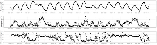 During the measurement period (16 December 2023 to 1 January 2024), the 15-minute wind speed, wind direction, and ambient temperature are shown in Figure 2. During the measurement period, the mean wind speed was 1.54 m s−1 (number of observations, n = 1572), and the mean ambient temperature was 21.8 °C (n = 1572); about 57% of measurement was obtained during southern winds.