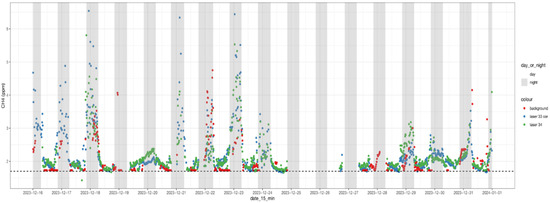 Fifteen-minute averaged CH4 concentrations of control cows (green), treatment cows (blue), and background levels (red) over the measurement period from 16 December 2023 to 1 January 2024. The dotted line represents 1.7 ppm.