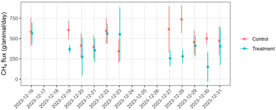 The measured concentrations were filtered following the filtering criteria, and the useful data were used to calculate 15-minute interval CH4 emission rates. There were 116 and 94 good datasets counted for the flux calculation, accounting for 26 and 21% of the useful data for the treatment and control groups, respectively. This was sufficient to represent the emissions from the source area. The data gap due to the filtering or instrument downtime was filled to minimise the potential bias in the flux calculations caused by irregular emission sampling combined with the diurnal pattern of cows’ emissions. We found that hourly CH4 emissions from both treatment and control cows showed a diurnal variation (Figure 4): higher emissions in the evening and low or no detectable emissions at night. However, there were no obvious correlations between the fluxes and wind friction velocity (u*). The 15-minute emission data were grouped into 3-hour time bins over the day, and daily emissions were calculated from the sum of the bin averages. Daily CH4 fluxes from both control and treatment cows varied over the measurement time (Figure 5). We calculated the mean daily CH4 flux of 494.9 ± 12 (mean ± standard error, SE) (n = 94) and 376.6 ± 12 (n = 116) g CH4/animal/day for the control and treatment cows, respectively, over the 16-day measurement period.