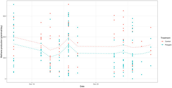 The effect of Polygain™ supplementation on methane emission was analysed using a linear mixed-effect model with treatment (Polygain™ vs. control) as the fixed effect and days of measurement as a random effect using the lmer function in lme4 package in R (Version 4.4.2) [64]. The results were plotted using ggplot2 and ggrepel packages. The significance level was set at p < 0.05. The model assumptions were checked using the diagnostic residual plot. Residuals were randomly scattered in the residual plot with no apparent patterns.