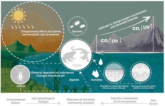 Understanding how host development and environmental variables influence the microbiome is a central goal in studying microbial communities in amphibians and other host taxa []. Factors affecting amphibian symbiotic microbiota are diverse and complex, encompassing environmental conditions (e.g., temperature, pH, and humidity), host factors (e.g., species, gender, and life stages), and human activities. These factors interact to shape the dynamic changes in amphibian symbiotic microbiota. To protect amphibian health and biodiversity, comprehensive measures are needed to mitigate negative impacts. Focusing on these factors elucidates the dynamic relationship between amphibians and their microbiota, promoting harmonious coexistence. This section will discuss the specific effects of temperature, altitude, humidity, host diet, and host specificity on amphibian symbiotic microbiota, aiming to uncover the causes of amphibian diseases and promote species diversity protection.