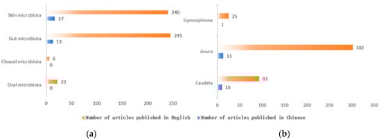 Amphibians are divided into three orders: Caudata, Anura, and Gymnophiona. Current research mainly focuses on Caudata and Anura, with relatively less on Gymnophiona (see Figure 2a for symbiotic microbiota of different amphibian groups). Given the limited research on the symbiotic microbiota of the order Gymnophiona, we will primarily focus on the orders Caudata and Anura. However, it is important to recognize that research on the symbiotic microbiota of Gymnophiona is also crucial, and efforts should be increased in this area in the future. Gymnophiona, a distinctive order of amphibians renowned for their worm-like bodies, lack of limbs, and significantly reduced or absent eyes [], predominantly inhabit moist terrestrial or aquatic environments, emerging nocturnally to feed on insects and worms. Their reproductive strategies encompass both oviparity, where eggs are laid, and viviparity, characterized by the birth of live young. Notably, certain species exhibit filial cannibalism, with larvae consuming nutrients secreted by the female prior to hatching. Gymnophiona are widely distributed across tropical regions, particularly in equatorial forests and savannas. However, due to their secretive lifestyle and the resultant difficulties in observing them in their natural habitat, comprehensive studies on their symbiotic microorganisms remain scarce. This gap in knowledge is significant as Gymnophiona play crucial roles in ecosystem dynamics and offer unique insights into the evolutionary history and biodiversity of amphibians, highlighting the need for further investigation into this enigmatic group.