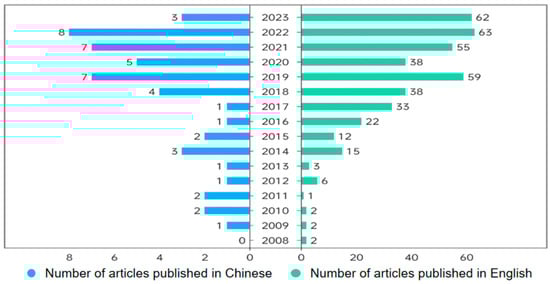 Studies on the symbiotic microbiota of amphibians have yielded significant findings both domestically and internationally. The literature in different languages reflects varying research contexts and cultural backgrounds. By separately searching Chinese and English databases, researchers can gain insights into the trends and focal points in each linguistic environment. This approach facilitates the identification of cross-cultural research disparities and connections. Additionally, conducting separate searches helps researchers efficiently locate relevant information, thereby enhancing the efficiency and quality of their studies. In the Web of Science (http://apps.webofknowledge.com) (accessed on 10 March 2024) database and Scopus (https://www.scopus.com) (accessed on 10 March 2024), the literature published up to 2024 regarding the symbiotic microbiota of amphibians was searched using the terms “Symbiotic microbiota” or “Skin microbiota” or “Gut microbiota” and “Amphibian”, with publication years limited to 2004–2024 and document type set to “Article”. Articles that are not representative of the research field were excluded after reviewing abstracts and keywords. Chinese literature was retrieved from China National Knowledge Infrastructure (https://www.cnki.net) (accessed on 10 March 2024), applying identical criteria. A total of 487 articles were collected, including 428 in English and 59 in Chinese. Through a comprehensive review of the literature published between 2004 and 2024, it is evident that the number of publications focused on amphibians and their associated microbiota has shown a steady increase over the years (Figure 3). Over the past decade, with the widespread application of next-generation sequencing technologies, there has been growing attention to the composition and function of amphibian symbiotic microbiota and the interactions between hosts and their symbiotic microbiota.