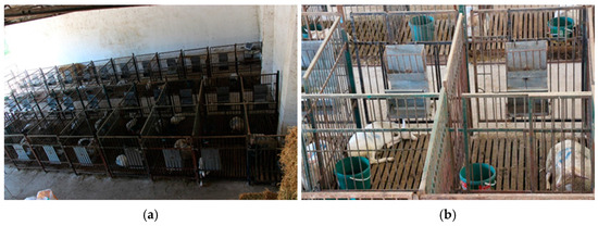 An overview of both the experimental barn (a) and individual pens for the lambs and goat kids (b).