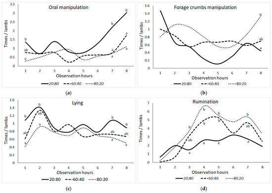 Change in the means of frequencies (times) per animal of (a) oral manipulation behavior (bar biting + crib biting + bucket biting + chain chewing + wool biting + ear biting), (b) forage crumbs manipulation, (c) lying, and (d) ruminating behaviors in lambs according to the observation hour (the difference between group means shown with different letters in the same observation hour is statistically significant, p ≤ 0.05).