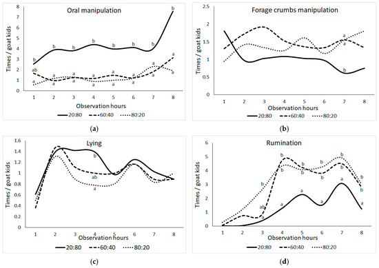 Change in the means of frequencies (times) per animal of (a) oral manipulation behavior (bar biting + crib biting + bucket biting + chain chewing + wool biting + ear biting), (b) forage crumbs manipulation, (c) lying, and (d) ruminating behaviors in goat kids according to the observation hour (the difference between group means shown with different letters in the same observation hour is statistically significant, p ≤ 0.05).