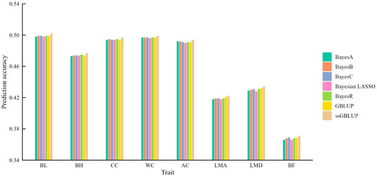 We herein used 50 K chip data and a five-fold cross-validation strategy for genomic prediction. ssGBLUP consistently outperformed the other models, achieving prediction accuracies ranging from 0.371 for BF to 0.502 for BL. Compared to GBLUP, the highest improvement was 0.003 for BL, BH, CC, and AC, while the lowest increase was 0.001 for LMA and LMD (Table S1). While the improvements over the other models were relatively small, this finding aligns with previous research demonstrating the superiority of ssGBLUP, attributed to its integration of both genomic and pedigree information, unlike GBLUP, which relies solely on genomic data (Figure 1).