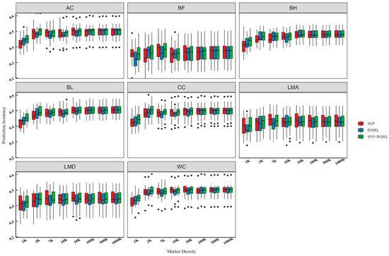 To investigate how marker density affects prediction accuracy, we categorized imputed WGS data into three variant types, including SNPs, INDELs, and a combination of SNPs + INDELs. These datasets were further divided into different marker densities, ranging from 1 K to 1000 K. The estimated heritability of the body measurement and carcass traits captured by SNPs and INDELs with different marker densities are inferred (Table S3). We found no significant difference in estimated heritability between SNPs and INDELs at low, medium, and high density. However, as marker density increased, the estimated heritability also increased. Using the estimated heritability from the 1 K marker dataset as a reference point, substantial increases were observed when the marker density reached the 1000 K level. The estimated heritability increased by 6% to 193% for SNPs, 25% to 86% for INDELs, and 3% to 150% for the combined SNPs + INDELs.