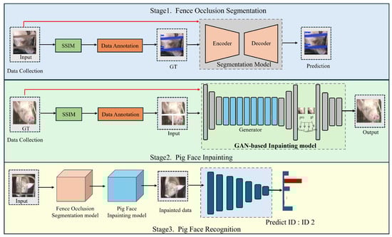 In Stage 1, to handle the commonly observed fence occlusion in farm environments, an encoder–decoder segmentation model is employed to identify and locate the occluded regions. We utilize Structural Similarity (SSIM) and manual annotations to prepare and label the pig face images, thus obtaining ground-truth masks that guide the segmentation network. Afterward, the labeled images are fed into the segmentation network during training to predict the occlusion regions. In Stage 2, once the occlusion regions are detected, the system applies a Generative Adversarial Network (GAN)-based inpainting model to fill the occluded areas. The input to the GAN consists of the original image and the occlusion masks. The generator reconstructs realistic textures for the occluded regions with the help of the discriminator, ensuring the quality of inpainting. The training process incorporates various constraints, such as perceptual loss, adversarial loss, and reconstruction loss based on the original image (ground truth), to enhance the authenticity and consistency of the inpainting results. In Stage 3, after the pig face image has been inpainted, clearer and more distinguishable facial features can be extracted for improved recognition. A classification network, whether conventional or deep learning-based, is used to extract features from the restored image, ultimately classifying the pig’s identity (e.g., “ID 2”). By combining the results of the previous two stages, Stage 3 achieves accurate recognition even in complex farm environments. By integrating these three stages, PigFRIS effectively addresses fence occlusion, improves the clarity of key facial features, and facilitates accurate and stable pig identification in real-world farm environments.