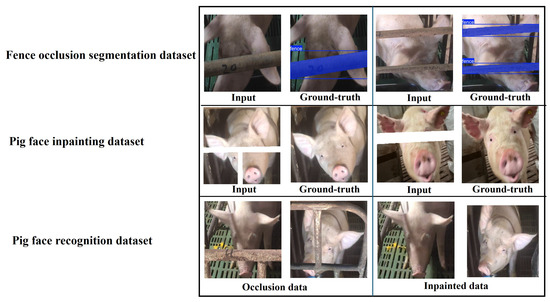 Examples of visualization from the three custom datasets used in our study. The top row showcases the Fence Occlusion Segmentation dataset, highlighting how fences partially obscure the pig’s face (input) and the corresponding ground-truth annotations. The middle row illustrates the pig face inpainting dataset, where artificially masked images (input) are paired with unoccluded ground-truth images. The bottom row shows the pig face recognition dataset, which contains both raw occlusion data and the resulting images after inpainting, enabling performance comparisons between obstructed and restored faces in the final recognition stage.
