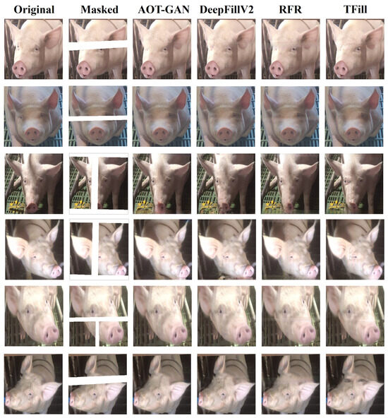 The inpainting outcomes underscore the advantages of AOTGAN in reconstructing occluded pig face images. As presented in Table 3, AOTGAN attains an FID of 51.48, outperforming other methods and suggesting a closer match to the statistical distribution of real, unobstructed images. Moreover, AOTGAN achieves an SSIM of 91.5, indicating the effective preservation of structural details and perceptual consistency in facial features. Although TFill yields marginally higher PSNR and a slightly lower MAE, these gains in pixel-level accuracy do not translate into producing globally realistic textures as effectively as AOTGAN. DeepFillv2, while offering competitive SSIM and PSNR values, exhibits a higher FID, implying less alignment with the overall realism of genuine pig faces. RFR, with substantially lower SSIM and PSNR, struggles to generate coherent restorations, revealing limitations in both fine-grained detail and global structural consistency.