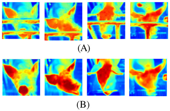 Figure 6 provides a detailed heatmap visualization that contrasts occluded pig faces (A) with their post-inpainting counterparts (B). In (A), the heatmaps clearly highlight the metal bars as regions of high intensity—typically represented in warmer colors such as red or yellow—which slice across the pig’s facial region. These high-intensity areas indicate that the segmentation model is capturing strong gradients or activation in those obstructed regions, reflecting the difficulty of extracting continuous facial features when fence occlusions are present. Conversely, (B) displays the same images after processing through our AOT-GAN inpainting module. In these visualizations, the previously occluded areas now exhibit a more homogeneous intensity distribution, with cooler colors replacing the disruptive high-intensity patterns. This shift in the heatmap signals that the inpainting process has effectively removed the metal bars and reconstructed the occluded regions, allowing the network’s attention to refocus on intrinsic facial cues such as the snout, eyes, and ears. The refined intensity gradients in (B) suggest a clearer delineation of morphological details, which ultimately contributes to improved downstream recognition performance. Overall, these heatmaps not only demonstrate the successful removal of occlusions but also provide visual evidence of how inpainting enhances feature continuity and clarity, thereby facilitating more robust pig face recognition.