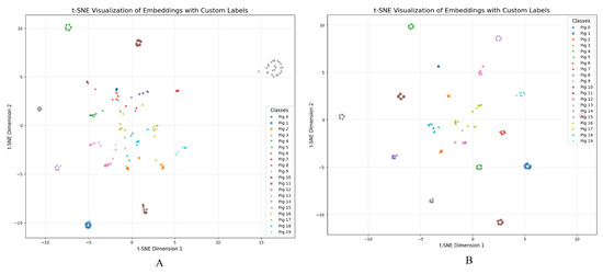 Figure 7A displays the two-dimensional t-SNE projection of feature embeddings extracted by EfficientNet-B2 from pig faces that remain partially obscured by fence bars. Due to these occlusions, many points cluster less distinctly, indicating that key identifying cues—such as the eyes and snout—are partially missing or distorted. Figure 7B presents the same images after passing through the first two stages of PigFRIS, where YOLOv11L segments the fence regions and AOT-GAN inpaints the missing facial areas. With the obstructing bars removed and the facial features more fully restored, the embeddings form tighter, more separable clusters. This clear improvement demonstrates how accurately recovering occluded facial details before recognition empowers EfficientNet-B2 to differentiate individual pigs more effectively.