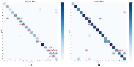 Confusion Matrix for Occluded (A) vs. Inpainted Pig Faces (B) Using EfficientNet-B2 on Testing dataset of Pig Face Recognition Dataset.