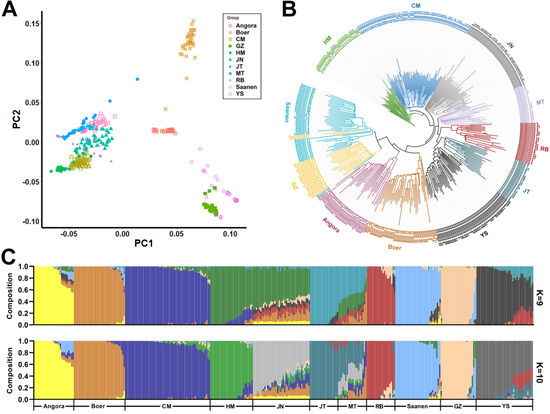 Genetic structure of 11 goat populations. (A) PCA analysis of 11 of goat breeds. (B) Neighboring tree of 351 goat individuals from 11 populations. (C) Genetic structure (K = 9 and 10, with the lowest CV error rate) inferred by admixture analysis.