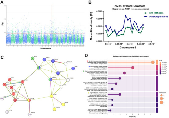 Functional analysis of genes within the selection-signature region of the YRD goat. (A) The most differentiated signal of FST occurs on chromosome 13. (B) Nucleotide polymorphisms were significantly reduced in YRD goats within the span of 62.9−64.6 Mb on chromosome 13. (C,D). Protein–protein interaction and reference publication enrichment analysis showed that genes within the region were significantly associated with coat color, skeletal muscle, and environmental adaptation in goats.