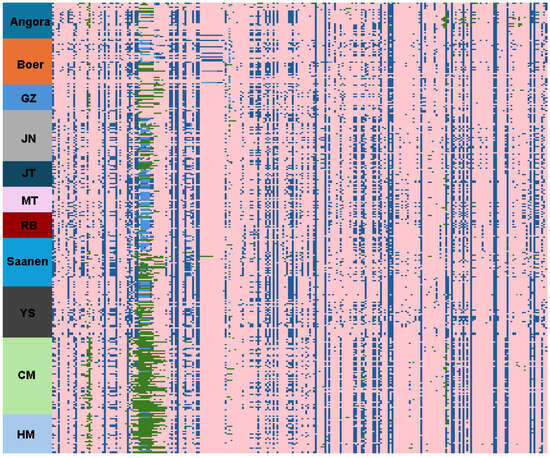 Gene polymorphisms of MYH7B in goat populations. In Figure 3, the reference genome is indicated in pink (0/0), the blue parts indicate the loci of genotypes (0/1 and 1/1), and the green parts represent the deletion genotype (./.).