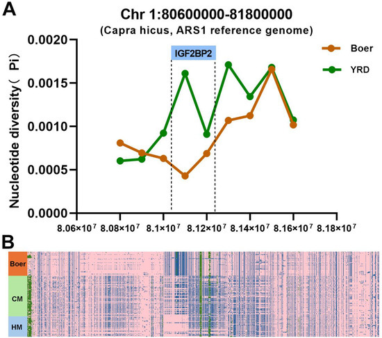 Selection signatures of the IGF2BP2 gene between Boer and YRD goats. (A) Nucleotide polymorphisms in IGF2BP2 in the Boer goat compared to the YRD population. (B) The genotype polymorphisms of IGF2BP2 in the YRD population and Boer breed. Consistent with the reference genome indicated in pink (0/0), the blue parts indicating the loci of genotypes (0/1 and 1/1), and the green parts representing the deletion genotype (./.).