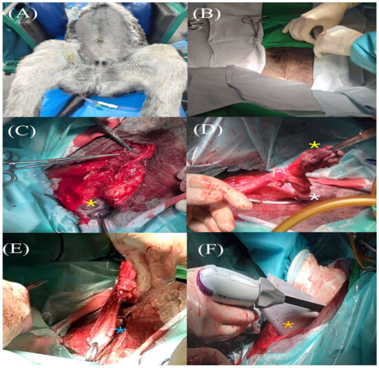 Modified two-step omphalectomy technique description. (A) Donkey foal placed on dorsal recumbency. (B) Aseptically prepared surgical area. (C) Double ligation of the umbilical vein cranial to the stump prior to vein transection using LigaSure™. Note that the stump has been grasped with forceps (yellow asterisk). (D) Dissection of the abdominal wall in order to isolate the internal umbilical structures and bladder while the stump is grasped (yellow asterisk). Note the previously transected umbilical vein has been clamped to the abdominal wall to keep the tension (white asterisk). (E) Double ligation of the left umbilical artery prior to artery transection with the Ligasure™ device (blue asterisk). (F) Both LigaSure™ and the surgeon’s hand are placed inside the abdominal cavity to remove the entire umbilical vein. Note the silicone sheet protecting the abdominal viscera (orange asterisk).