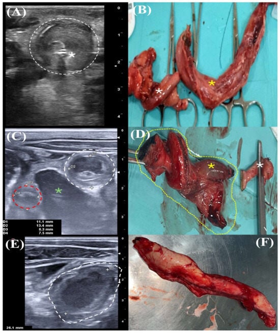 Ultrasound and macroscopic views of the internal umbilical structures removed using the modified two-step omphalectomy. (A) Internal umbilical remnant ultrasound showing an enlarged umbilical vein (higher than 1 cm, dotted white line) with a hyperechogenic foci displaying acoustic shadow (white asterisk). (B) Enlarged abscessed umbilical vein (yellow asterisk) in a donkey foal. Compare the size of the umbilical vein (yellow asterisk) with the rest of the internal umbilical stump and the bladder apex (white asterisk). (C) Internal umbilical remnant ultrasound showing an enlarged umbilical artery (greater than 1 cm, white dotted line) compared to a normal-sized and ultrasonographic artery (red dotted line). Bladder and urachal communication (patent urachus) can also be seen in the image (green asterisk). (D) Macroscopic view of an enlarged, congestive, and edematous umbilical artery (yellow asterisk). Note the external stark and bladder apex (yellow spotted line) and an umbilical vein of normal size and appearance (white asterisk). (E) Ultrasound of the abdominal cavity showing a rounded mass (approx. 2.6 cm) close to the liver displaying an echogenic wall with an hypoechogenic content compatible with a liver abscess (white dotted line). (F) Macroscopic image of the abscessed umbilical vein remnant forming an abscess in the entry of the liver.