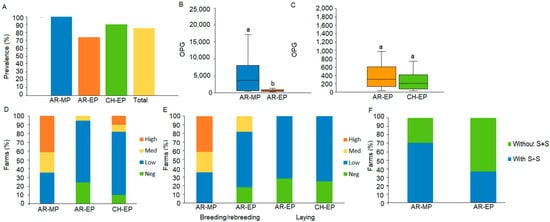 Eimeria sp. prevalence, oocyst quantification, and OPG levels in FPPSs. (A) Farm percentages of Eimeria sp. in Argentina meat production farms (AR-MP), egg production farms (AR-EP), and Chilean egg production farms (CH-EP). (B,C). Eimerian-oocyst excretion quantified by oocysts per gram (OPG) in AR-MP and AR-EP farms (B) and AR-EP and CH-EP farms (C). Different lowercase letters indicate significant differences. (D) Proportions of farms with different OPG levels (high, medium, low, and negative) among the production systems studied in both countries. (E). Proportions of farms with different OPG levels according to the production stage in AR-MP and AR-EP breeding and rebreeding stages, AR-EP and CH-EP laying stage. (F) Percentages of farms with or without recorded clinical signs (CS) in Argentine MP and EP.