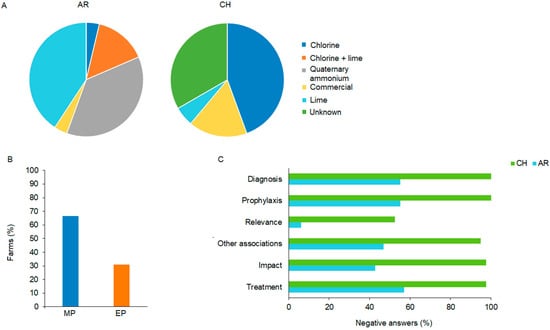 Disinfectants, chemical drug usage, and knowledge of chicken coccidiosis. (A) Distribution of the types of disinfectants used in FPPS in AR and CH. (B) Percentages of Argentinian meat (MP) and egg-productive (EP) farms that use chemical drugs. (C) Percentages of negative answers regarding diagnosis, prophylaxis, relevance, the impact, and treatment of coccidiosis in FPPSs in Argentina (AR) and Chile (CH). The survey included closed questions (yes or no).