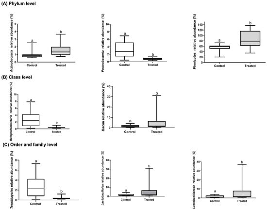Relative abundance (%) of control and GPGR piglets for (A) Actinobacteria, Proteobacteria, and Firmicutes (phylum level); (B) Betaproteobacteria and Bacilli (class level); (C) Tremblayales and Lactobacillales (order level); and Lactobacillaceae family. Different letters indicate statistically significant differences (p < 0.05).