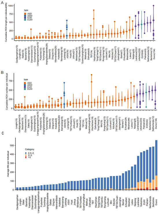 Pigs have undergone distinct domestication histories in Asia and Europe, resulting in unique genetic architectures. Previous studies have shown that Asian domestic pigs predominantly harbor long ROH segments, reflecting recent bottlenecks. In contrast, European pigs exhibit more numerous but shorter ROH segments, indicative of intensive artificial selection [5]. This continental divergence provides a unique model system to investigate how human-mediated selection pressures differentially sculpt genome architecture during breed formation. In commercial breeds, ROH islands are enriched for genes linked to economically important traits, such as reproduction in Yorkshire pigs [9], immunity and growth in Duroc pigs [10], and fat deposition in Large White pigs [11]. Identification of candidate genes in commercial pig breeding populations will be applied to pig breeding to improve pig economics. Conversely, ROH in indigenous breeds are often associated with environmental adaptability, helping breeders develop more effective conservation programs and breeding materials for resilience [12,13,14].